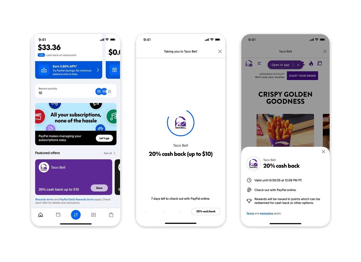 PayPal and Venmo can now be set as default payment options in the Taco Bell app and website – and customers checking out with PayPal can earn 20% cash back1 every week